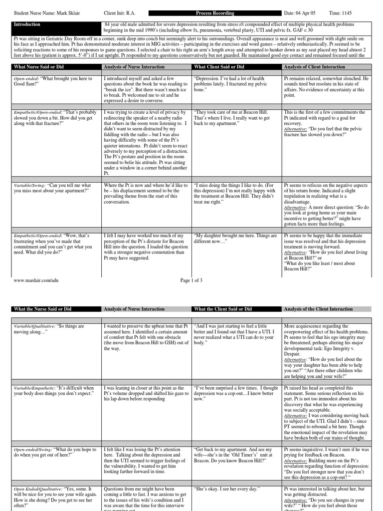 Process Recording from www.coursehero.com This is its purpose, benefits and steps. Assessment | biopsychology | comparative | cognitive | developmental | language | individual differences | personality | philosophy | social | methods | statistics | clinical | educational | industrial | professional items | world psychology |. I choose her as my client for process recording and case report because i was the nurse on duty 3. Start studying the nursing process (recording 7). The nursing process is a modified scientific method. Recording nursing diagnosis, reasons, objectives, and nursing interventions. Assessment diagnosis planning and outcome the nursing process (continued). Bipolar disorder, suicidal ideation, suicides attempts.